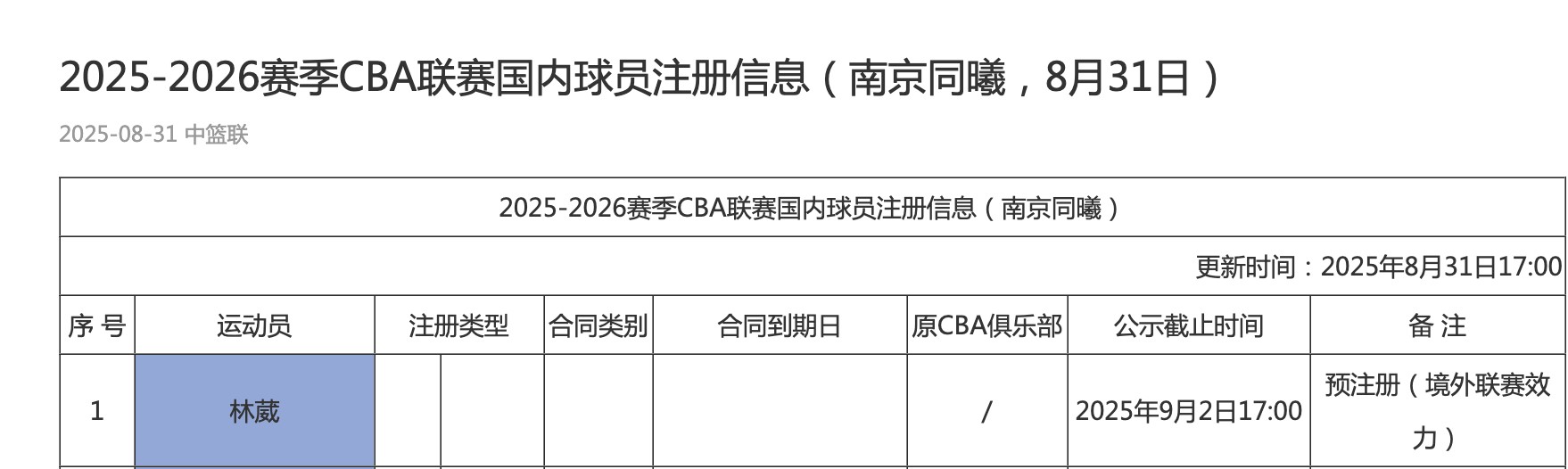北京时间8月31日,CBA官方更新了各队国内球员注册信息,目前在海外打球的曾凡博、崔永熙、杨瀚森、林葳四名球员均完成了预注册。