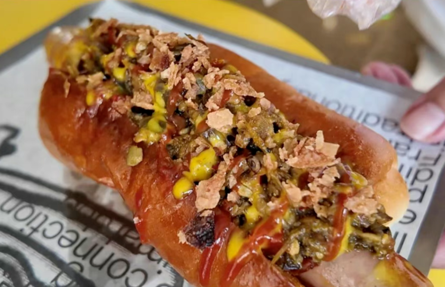 淋上番茄酱、黄芥末酱和黑椒特色酱料,